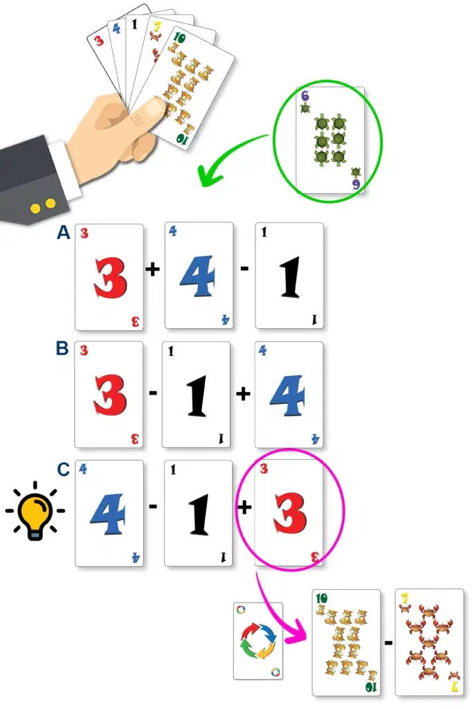 👉 Le troisième choix est le plus stratégique : en terminant sur la carte 3, le joueur se prépare pour le tour suivant, où il pourra utiliser le calcul 10 – 7 = 3 (si la carte du dessus n’a pas changé entre-temps).